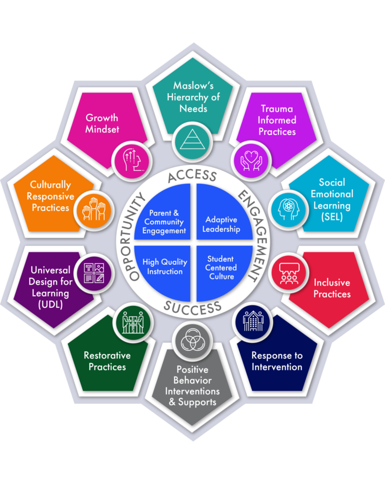 The Quantum 10 (Q10) is a fusion of 10 different elements: two theories (Maslow’s Hierarchy of Needs and Growth Mindset), five frameworks (Positive Behaviors Interventions and Supports (PBIS), Response to Intervention (RTI), Social Emotional Learning (SEL), Universal Design for Learning (UDL), and Trauma-Informed Practice (TI), and three practices (Restorative, Culturally Responsive, and Inclusive). The Core Four are High-Quality Instruction, Parent and Community Engagement, Adaptive Leadership, and Student-Centered Culture. The Core drives the Q10.